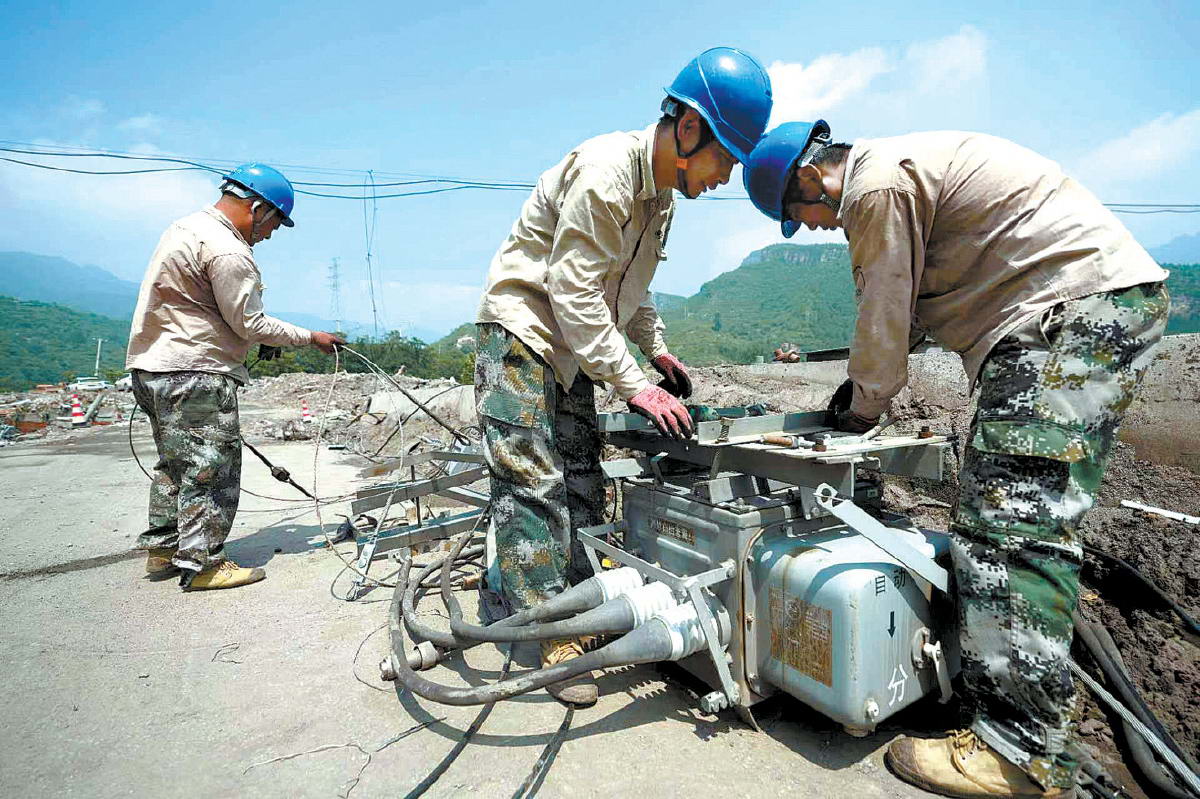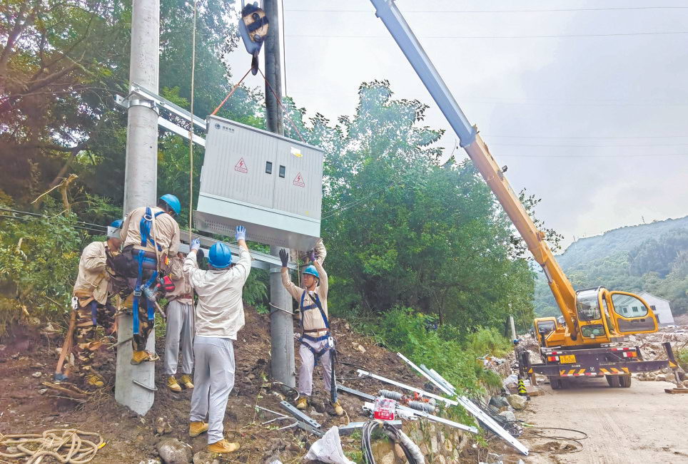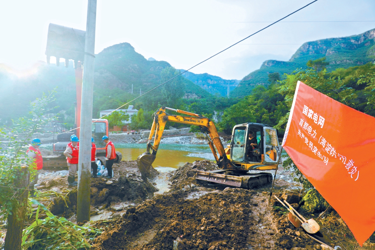 朝陽區(qū)搶修團隊在門頭溝王平鎮(zhèn)南澗村對部分受損線路開展復(fù)電搶修。張文靜 攝