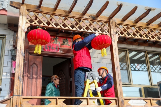 2月6日,國(guó)網(wǎng)北京門頭溝供電公司妙峰山供電所員工在炭廠村開(kāi)展春節(jié)保電走訪,到獨(dú)居老人家檢查“煤改清潔能源”用電設(shè)備,幫助掛紅燈籠。(張文靜 攝)