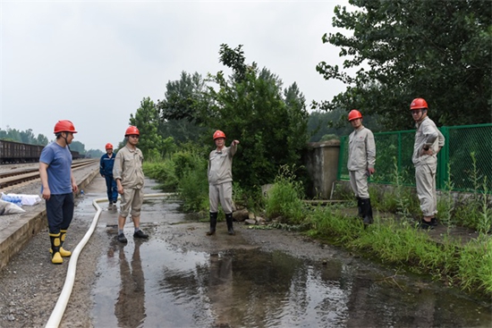 10時(shí)30分,新增的三臺(tái)排水泵及排水管送達(dá)翻車機(jī)區(qū)域,檢修人員迅速安裝后“馬力全開”開始排水。中午12時(shí),傾盆大雨間,廠長江高潮與設(shè)備部、發(fā)電部、維護(hù)部機(jī)務(wù)車間、維護(hù)部電務(wù)車間負(fù)責(zé)人堅(jiān)守翻車機(jī)區(qū)域,現(xiàn)場坐鎮(zhèn)指揮,指導(dǎo)遷車臺(tái)排水工作。
