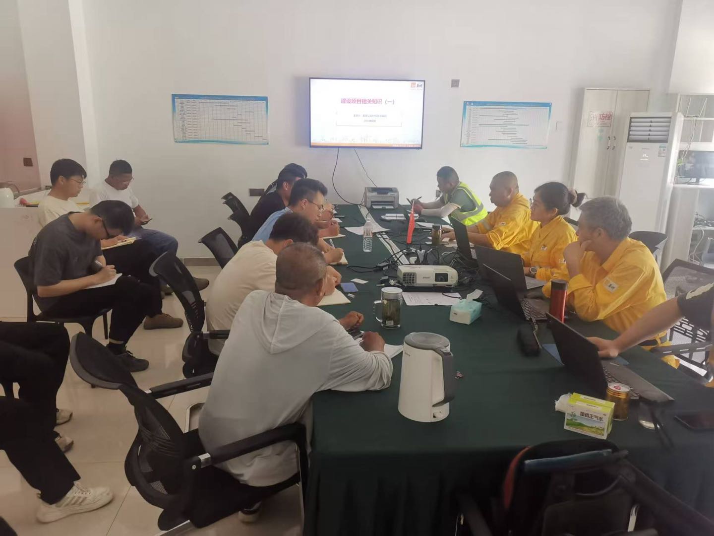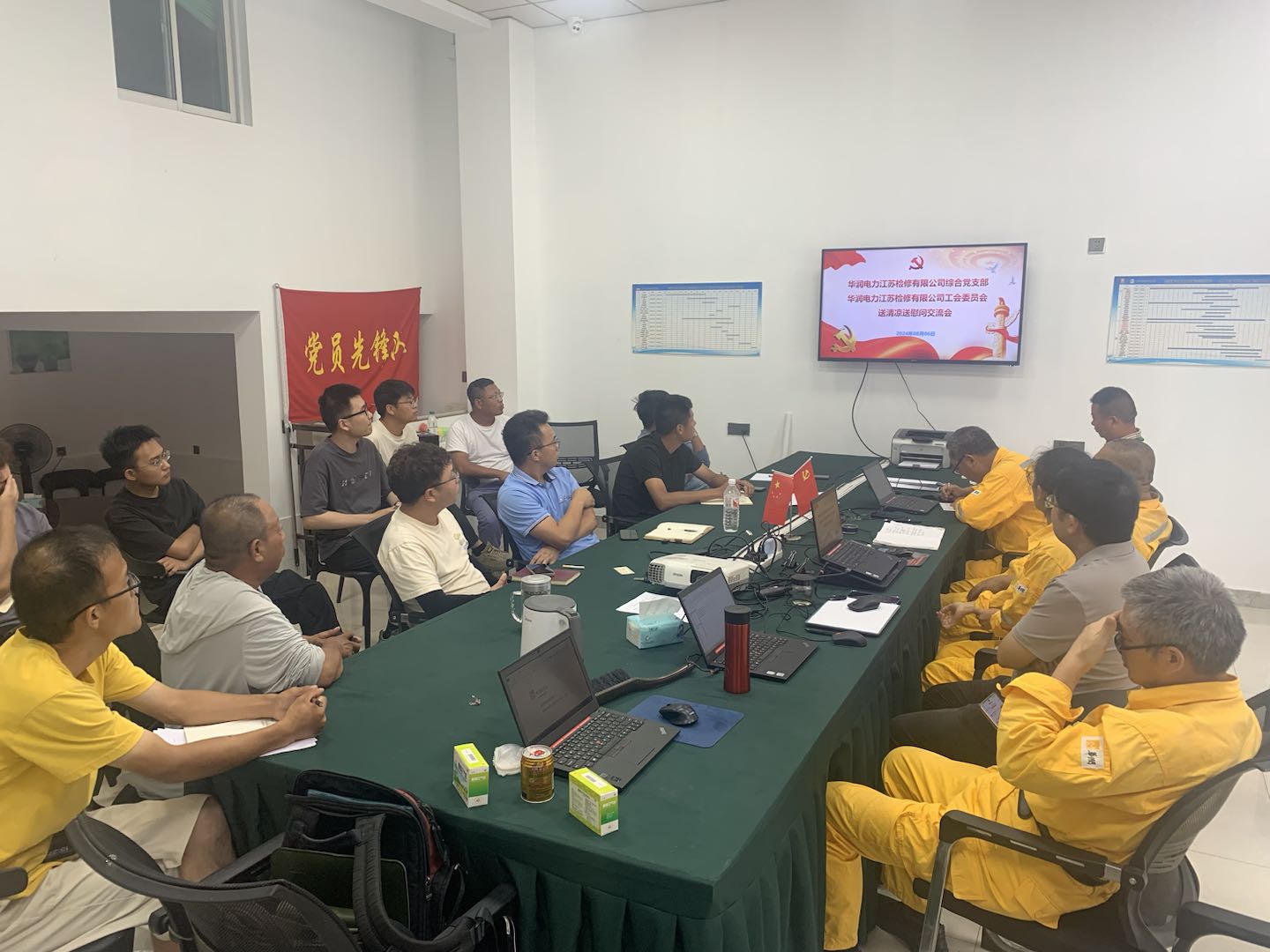 在本次送清涼活動中,黨支部成員結合生產(chǎn)工作,也準備了針對建設項目的法律法規(guī)等課件,對清江浦建設項目所有參建單位的管理人員共 16 人,開展了光伏建設項目相關知識的培訓及測試。培訓結束后,并對施工現(xiàn)場進行了相關安全檢查,重點檢查了升壓站區(qū)域施工現(xiàn)場的安全防護措施、個人防護裝備以及施工現(xiàn)場的安全管理狀況,確保每一項安全規(guī)定都能被嚴格遵守。同時,還對工程進度予以了評估,給出了具有建設性的意見和建議。