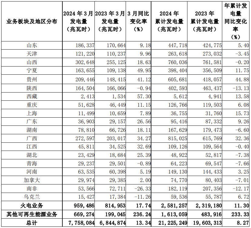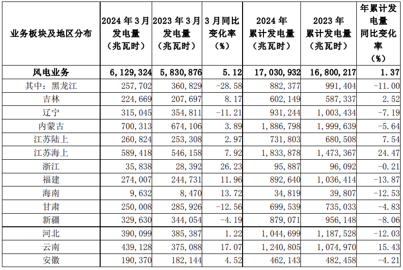 龍?jiān)措娏?月8日公告,2024年3月按合并報(bào)表口徑完成發(fā)電量7,758,084兆瓦時(shí),較2023年同期同比增長13.34%。其中,風(fēng)電發(fā)電量增長5.12%,火電發(fā)電量增長17.74%,其他可再生能源發(fā)電量增長236.24%。