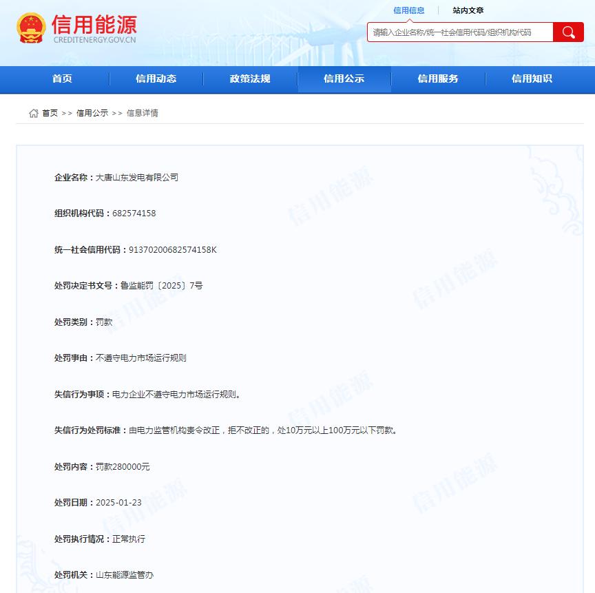 日前,信用能源公示了對(duì)大唐山東發(fā)電有限公司的行政處罰決定,處罰決定書(shū)文號(hào)魯監(jiān)能罰〔2025〕7號(hào)顯示,大唐山東發(fā)電有限公司不遵守電力市場(chǎng)運(yùn)行規(guī)則,山東能源監(jiān)管辦依據(jù)《山東省電力市場(chǎng)監(jiān)管辦法(試行)》《電力監(jiān)管條例》相關(guān)規(guī)定,對(duì)其處以罰款280000元處罰。