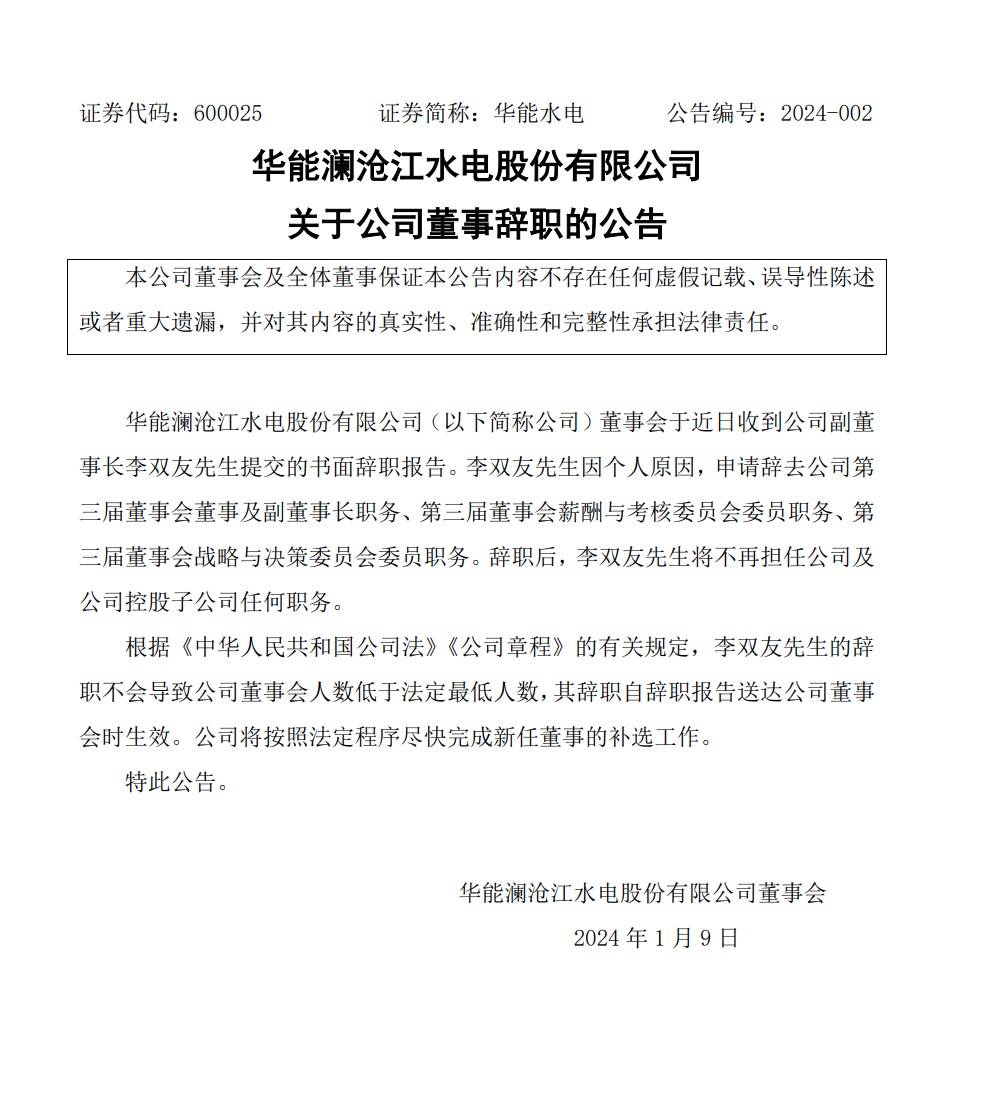 1月9日,華能水電發(fā)布公告稱,公司董事會于近日收到公司副董事長李雙友先生提交的書面辭職報告。李雙友先生因個人原因,申請辭去公司第三屆董事會董事及副董事長職務、第三屆董事會薪酬與考核委員會委員職務、第三屆董事會戰(zhàn)略與決策委員會委員職務。辭職后,李雙友先生將不再擔任公司及公司控股子公司任何職務。
