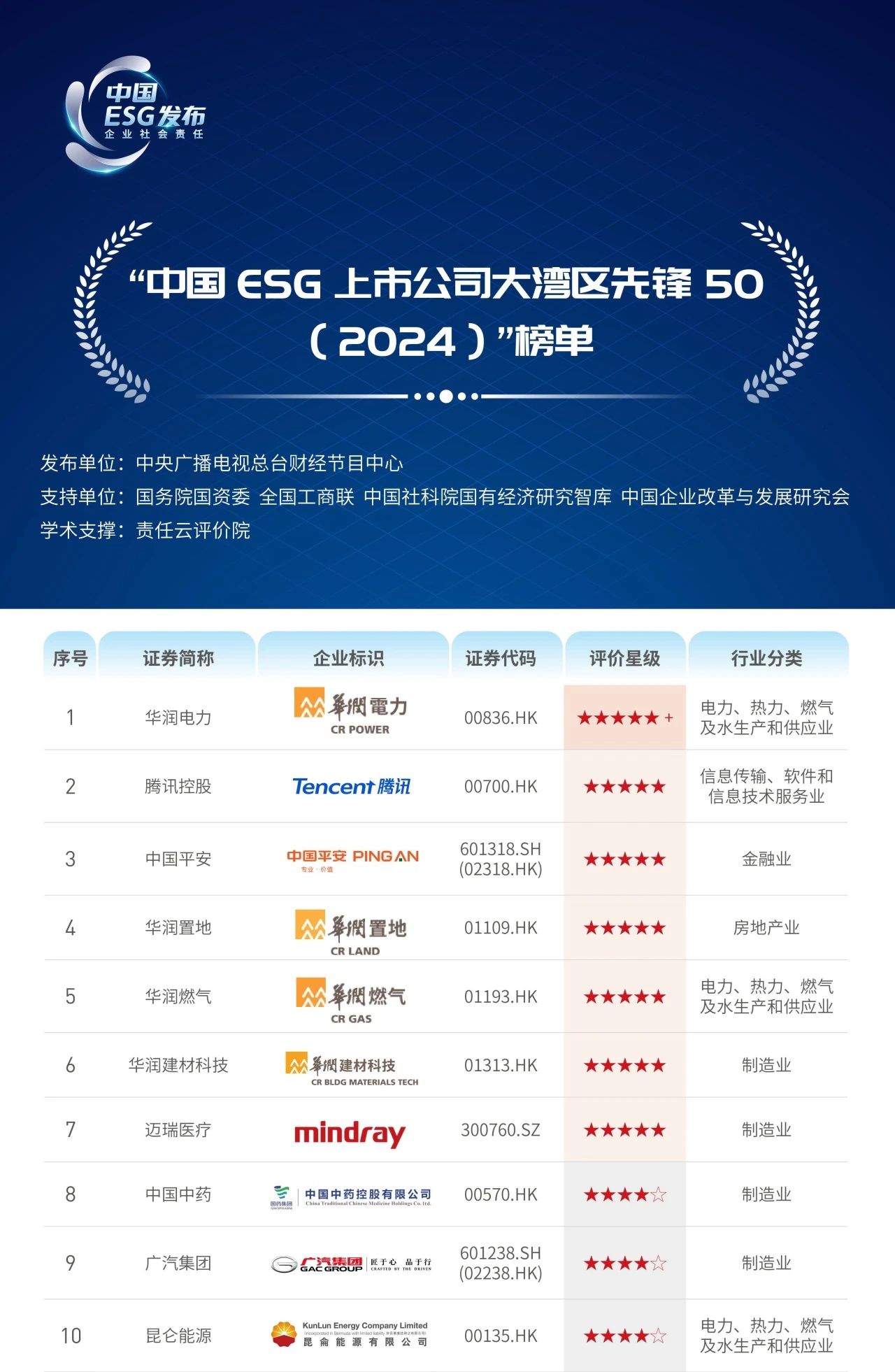 2024年8月27日,由中國企業(yè)改革與發(fā)展研究會、責任云研究院主辦,廣東省國資委聯(lián)合主辦,中央廣播電視總臺參與并報道的“第四屆國企社會價值論壇暨ESG中國·粵港澳大灣區(qū)企業(yè)社會責任發(fā)布會”在廣州召開?;顒影l(fā)布“中國ESG上市公司大灣區(qū)先鋒50”,華潤電力成為榜單內(nèi)唯一達到五星佳級水平的企業(yè),位列第1名。