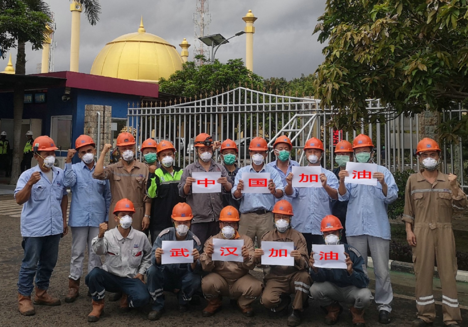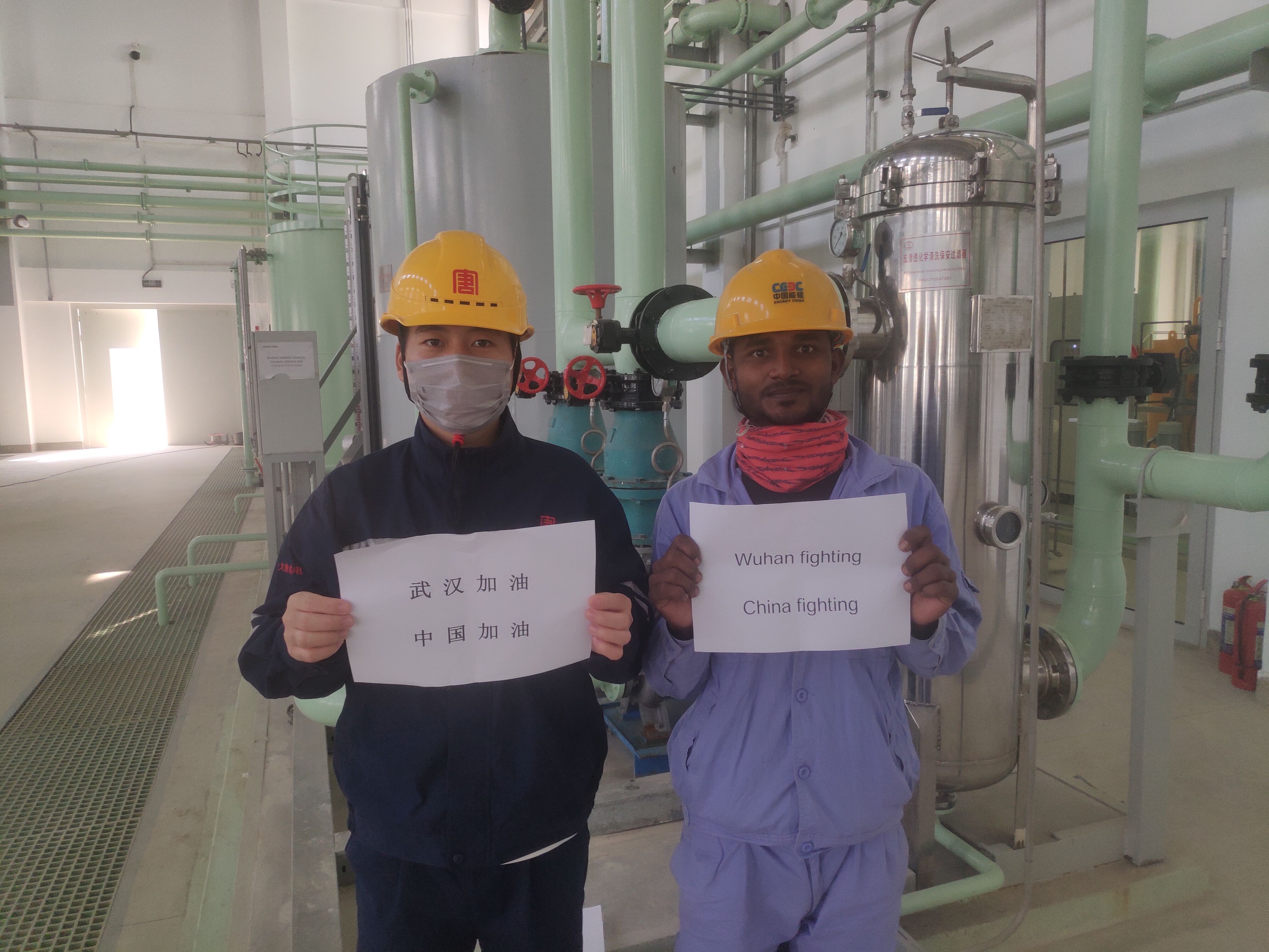 在大唐安徽發(fā)電公司承擔(dān)運維工作的印尼芝拉扎電站,中印雙方人員共同為中國加油、為武漢加油。(朱成文/攝)