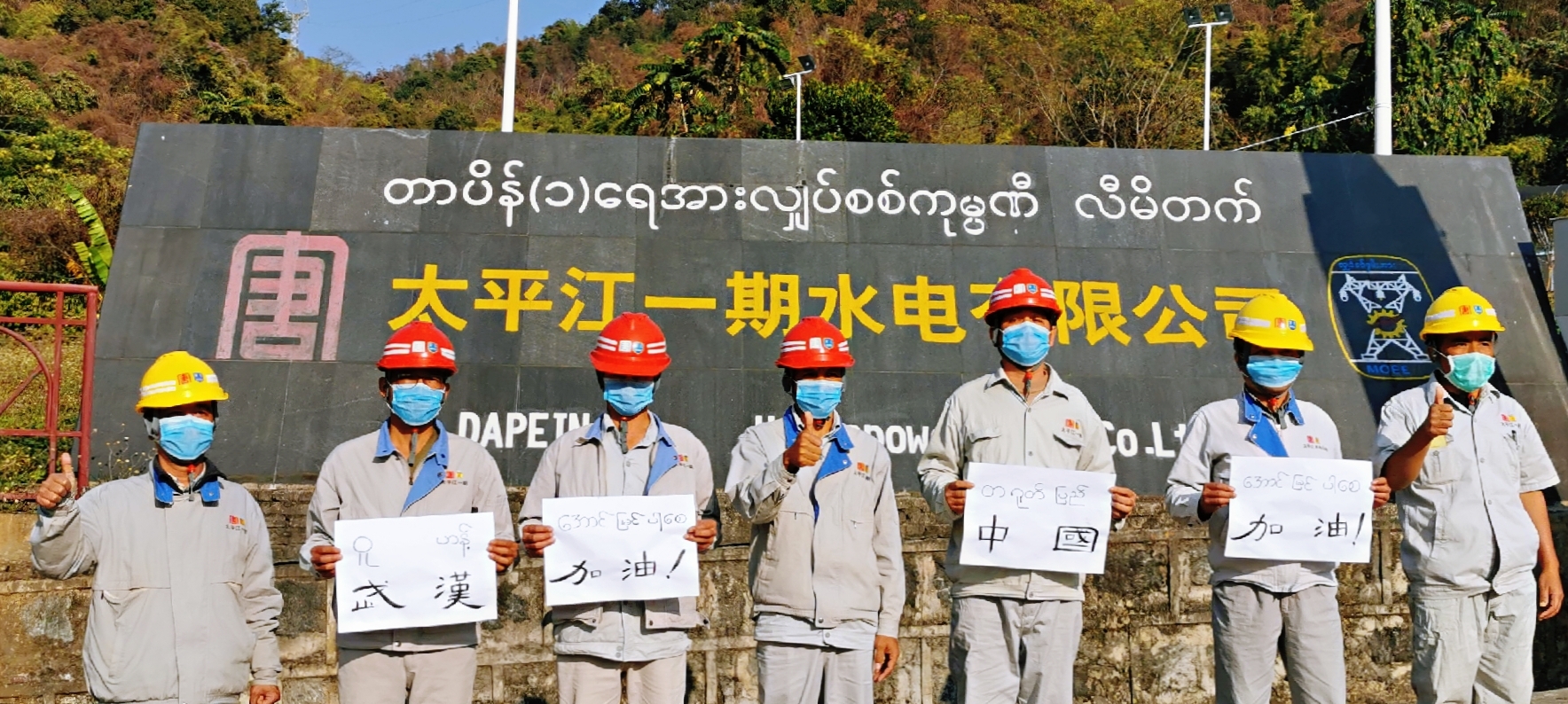 緬甸電力部派駐太平江電站的全體代表與大唐職工一起努力防疫抗疫,他們?yōu)槲錆h加油!為中國加油?。ɡ钣辣?攝)