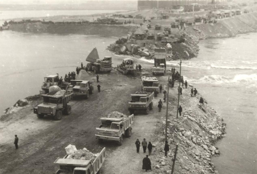 1980年10月,葛洲壩工程大江截流工程施工現(xiàn)場。