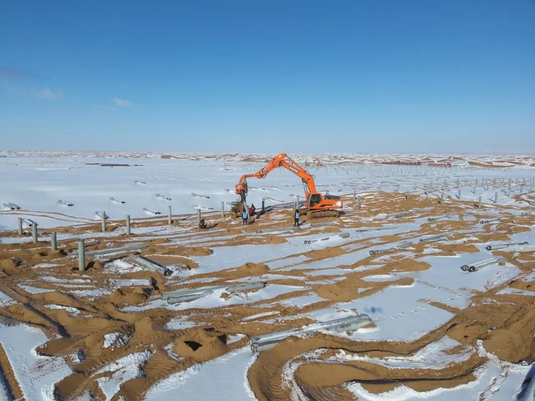 寧夏騰格里沙漠新能源基地二期200萬千瓦光伏項目建設(shè)人員正在進行打樁作業(yè)。