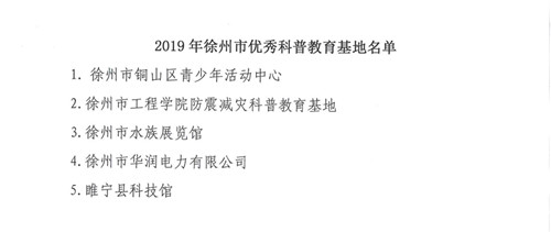 中國電力網(wǎng)訊 近日,徐州市科協(xié)發(fā)布《關(guān)于公布2019年度省、市級優(yōu)秀科普教育基地名單的通知》(徐科協(xié)辦發(fā)﹝2020﹞5號),公司在72家科普教育基地中脫穎而出,被評為2019年徐州市優(yōu)秀科普教育基地,并獲得專項獎勵,是徐州市唯一一家獲得表彰的企業(yè)類科普教育基地。