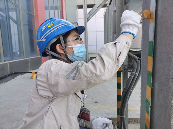 工作人員為接地扁鋼刷涂黃綠色彩漆