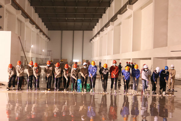 在到達(dá)位于汽機(jī)房17米平臺的GIS室后,女職工明確分工,協(xié)同配合,裝水、噴水、清掃、沖水、拖地……分區(qū)域、分小組地對GIS室地面進(jìn)行清潔。當(dāng)大家看著地面從塵土漫漫逐漸變成干凈整潔的地面,干凈的面龐已是塵土夾雜著汗水,臉上的笑容依舊如初,勞動的成就感,為工程建設(shè)作出力所能及貢獻(xiàn)的自豪感充溢著大家的內(nèi)心。經(jīng)過兩個多小時的勞動,順利完成了600平方米GIS室地面的清潔。