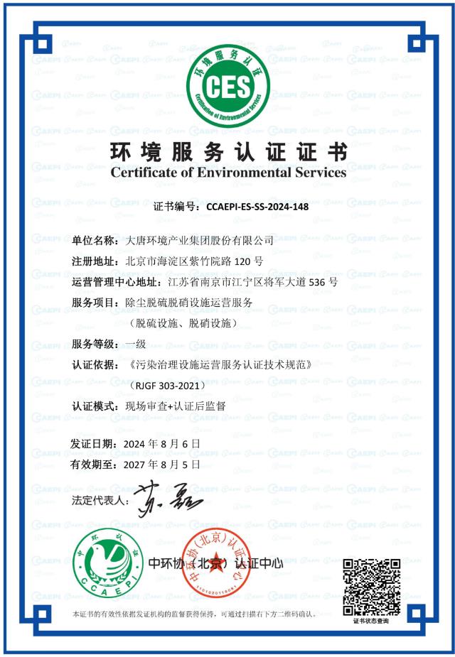 大唐環(huán)境特許經(jīng)營分公司順利取得“除塵脫硫脫硝設(shè)施運(yùn)營服務(wù)”一級運(yùn)營資質(zhì)證書