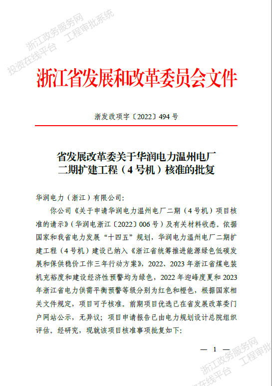 11月8日,華潤(rùn)電力浙江公司溫州電廠4號(hào)機(jī)正式獲得浙江省發(fā)展和改革委員會(huì)核準(zhǔn)批復(fù)。