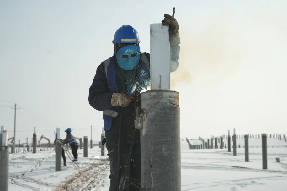 行走在項(xiàng)目現(xiàn)場,盡管已經(jīng)立春,但氣溫依舊非常低,寒風(fēng)刺骨。此刻,為保障工程順利推進(jìn),百余名建設(shè)者各就其位忙碌著,一切井然有序。看著項(xiàng)目北區(qū)100萬千瓦工程密密麻麻的光伏樁,和散落其中焊樁頭、安裝支架的建設(shè)場景,龍?jiān)磳幭墓鞠嚓P(guān)負(fù)責(zé)人說:“北區(qū)光伏樁有40萬根。如此大規(guī)模的項(xiàng)目,時(shí)序管控最為關(guān)鍵。我們目標(biāo)是要打造‘兩高一低’精品工程,從設(shè)計(jì)就已經(jīng)充分考慮后續(xù)的所有管理重點(diǎn),施工工藝、工程質(zhì)量、設(shè)備管控等等,現(xiàn)場施工各標(biāo)段各自為戰(zhàn),時(shí)序緊湊,施工進(jìn)度安全高效快速。”