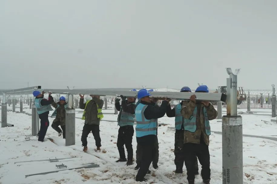 茫茫的沙海里,迎著凜冽寒風(fēng),踩在厚厚的積雪里,項(xiàng)目經(jīng)理李超翔和土建經(jīng)理張國睿的鞋子已濕透了,他們和施工單位、監(jiān)理單位值班人員一起,一如往常,一絲不茍地堅(jiān)守在崗位上,仔細(xì)地檢查著預(yù)制管樁校準(zhǔn)、焊樁頭和裝支架的工程質(zhì)量,叮囑施工人員要把控好安全和質(zhì)量。