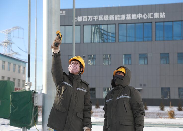 華能上都風電基地中心匯集站運行人員檢查測量升壓站設備溫度,保障設備冬季正常運行。