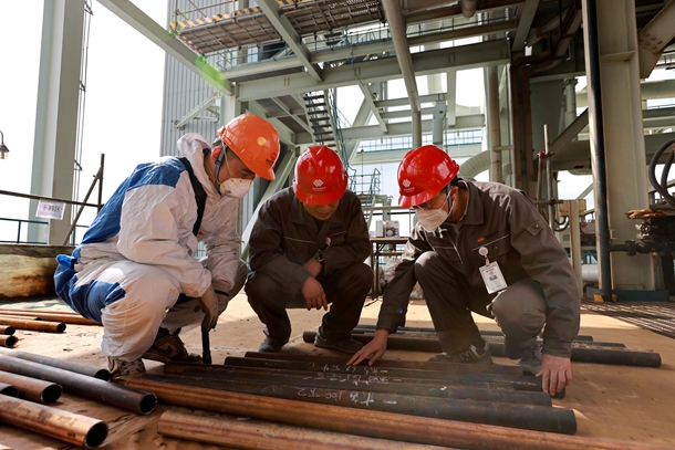 圖為馮程(左)、張永全(中)和張宇飛檢查受熱面管道磨損情況