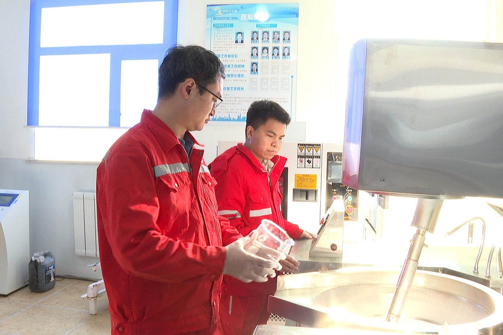 圖為侯鵬飛和徒弟趙博宇正在進行乳膠基質(zhì)黏度檢測