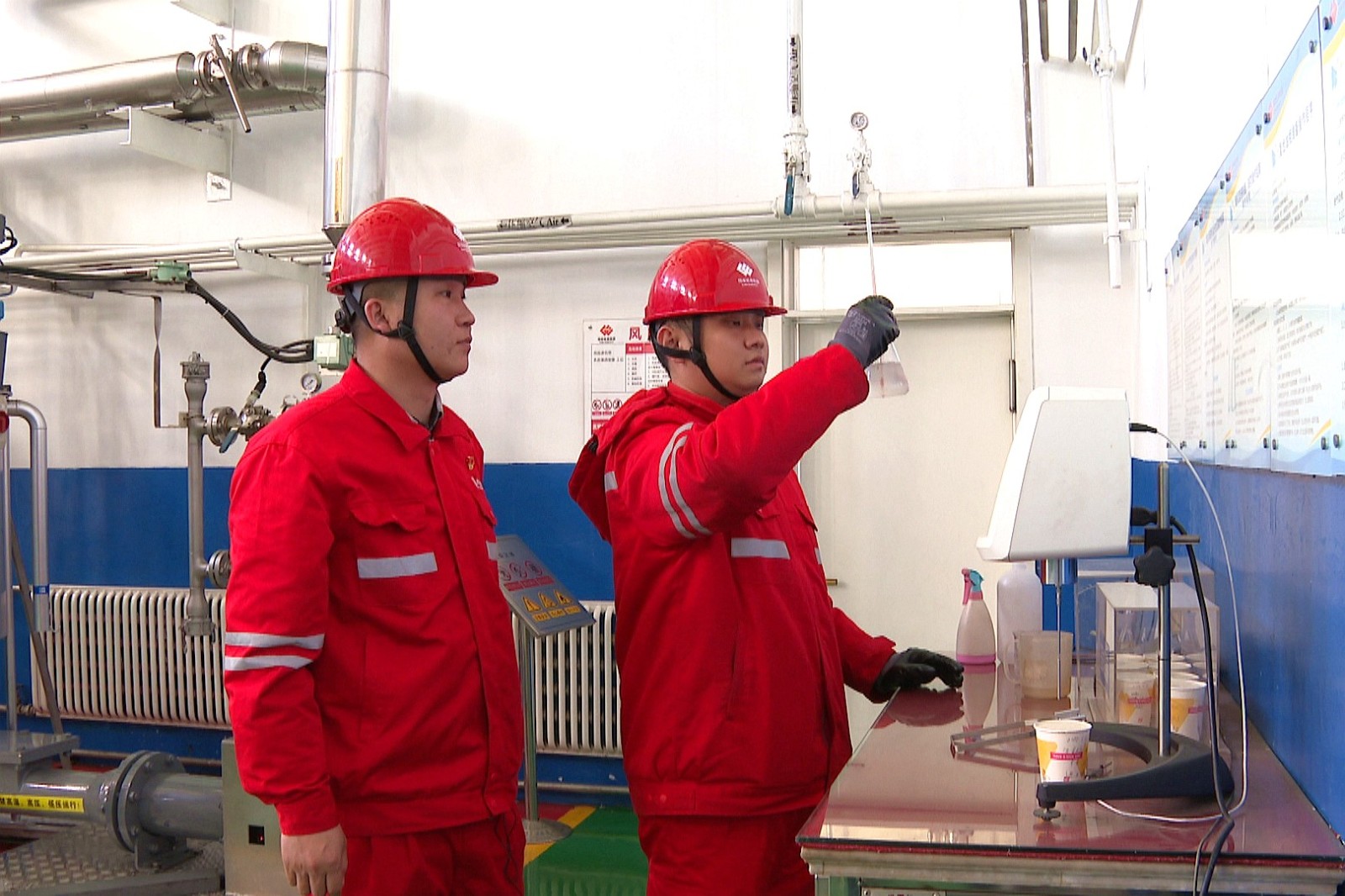 在炸藥廠乳化工房內(nèi),剛?cè)肼毑痪玫拇髮W(xué)生趙博宇正和師傅侯鵬飛進行設(shè)備巡檢。趙博宇的臉上寫滿了認真和專注,侯鵬飛在一旁耐心地指導(dǎo)。