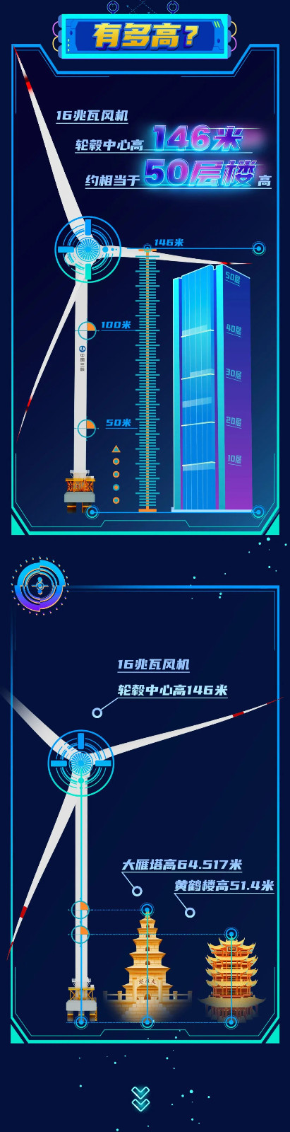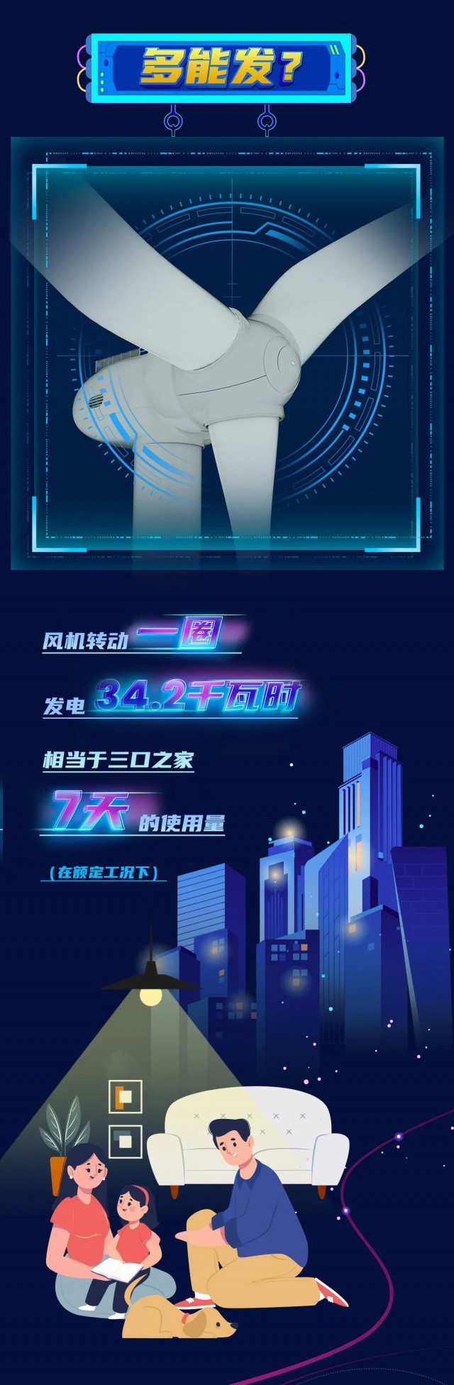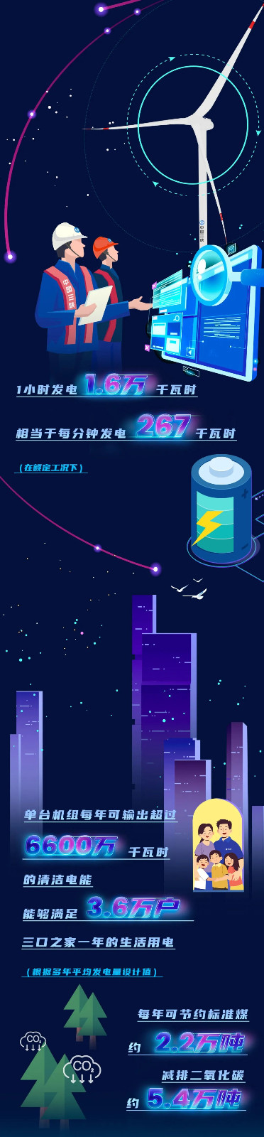 此次下線的單機(jī)容量16兆瓦海上風(fēng)電機(jī)組,葉輪直徑252米,葉輪掃風(fēng)面積約5萬平方米,約相當(dāng)于7個標(biāo)準(zhǔn)足球場大;輪轂高度達(dá)146米,約相當(dāng)于一座50層大樓的高度。在額定工況下,單臺機(jī)組每轉(zhuǎn)動一圈可發(fā)電34.2千瓦時。根據(jù)多年平均發(fā)電量設(shè)計值,單臺機(jī)組每年可輸出超過6600萬千瓦時的清潔電能,能夠滿足3.6萬戶三口之家一年的生活用電,可節(jié)約標(biāo)煤約2.2萬噸,減排二氧化碳約5.4萬噸。