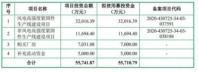 本次IPO,飛沃科技公開發(fā)行A股股票1347萬股,發(fā)行價(jià)格72.5元/股,募集資金總額約為9.77億元,擬用于風(fēng)電高強(qiáng)度緊固件生產(chǎn)線建設(shè)項(xiàng)目、非風(fēng)電高強(qiáng)度緊固件生產(chǎn)線建設(shè)項(xiàng)目、購買廠房、補(bǔ)充流動(dòng)資金等。
