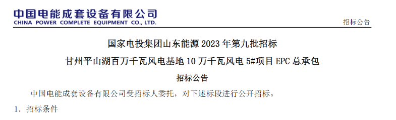 公告顯示,甘州平山湖百萬千瓦風(fēng)電基地 10 萬千瓦風(fēng)電 5#項目位于甘肅省張掖市甘州區(qū)平山湖蒙古族鄉(xiāng)境內(nèi),裝機容量 100MW,計劃安裝 10臺單機容量 5.5MW、 9 臺單機容量 5.0MW 的風(fēng)電機組,新建 100MW 風(fēng)電場、 110kV 升壓站、15MW/60MWh 儲能、新建約 5 公里 110kV 送出線路接入對側(cè) 330kV 匯集站。