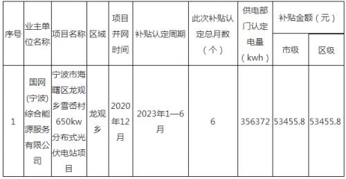根據(jù)《寧波市家庭屋頂光伏補貼專項資金管理暫行辦法》(甬發(fā)改能源〔2018〕36號)、《海曙區(qū)節(jié)能降耗專項資金管理辦法》(海發(fā)改〔2019〕36號)等文件精神,海曙區(qū)2023年上半年符合非自然人家庭屋頂光伏發(fā)電補貼項目共1個,總并網(wǎng)容量650kw,2023年上半年補貼發(fā)電周期為2023年1月1日至2023年6月30日,合計發(fā)電量356372千瓦時,需撥付補貼資金106911.6元(其中:市級補貼資金53455.8元,區(qū)級配套補助資金53455.8元)。