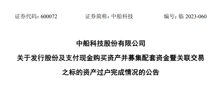 公告披露,截至本公告日,中船科技發(fā)行股份及支付現(xiàn)金購買資產(chǎn)并募集配套資金暨關(guān)聯(lián)交易之標的資產(chǎn)交割及過戶手續(xù)已辦理完畢。