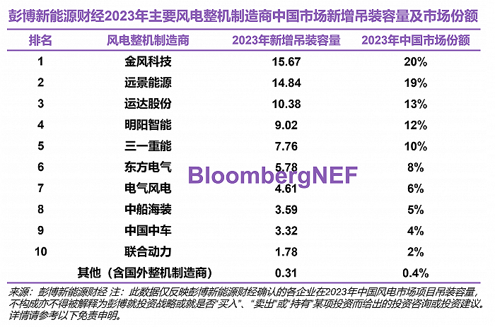 彭博新能源財(cái)經(jīng)稱(chēng),三一重能2023年的陸上風(fēng)電吊裝容量相較于2022年幾乎翻倍并位列第四,東方電氣實(shí)現(xiàn)了陸上風(fēng)電吊裝容量三倍增長(zhǎng),排名第五。