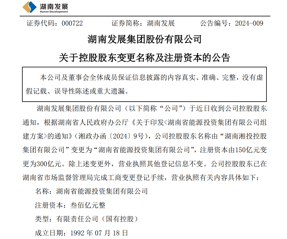 公告顯示,湖南發(fā)展于近日收到公司控股股東通知,根據(jù)湖南省人民政府辦公廳《關于印發(fā)<湖南省能源投資集團有限公司組建方案>的通知》(湘政辦函〔2024〕9號),公司控股股東名稱由“湖南湘投控股集團有限公司”變更為“湖南省能源投資集團有限公司”,注冊資本由150億元變更為300億元。除上述變更外,營業(yè)執(zhí)照其他登記信息不變。公司控股股東已在湖南省市場監(jiān)督管理局完成工商變更登記手續(xù)。