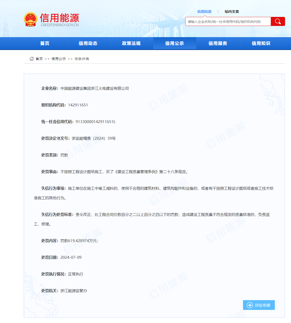 浙江能源監(jiān)管辦發(fā)布的《行政處罰決定書》(浙監(jiān)能稽查〔2024〕39號)中依據《建設工程質量管理條例》(下稱“條例”)第六十四條對中國能建浙江火電處以了619萬余元的罰款。條例明確:施工單位在施工中偷工減料的,使用不合格的建筑材料、建筑構配件和設備的,或者有不按照工程設計圖紙或者施工技術標準施工的其他行為的,責令改正,處工程合同價款百分之二以上百分之四以下的罰款;造成建設工程質量不符合規(guī)定的質量標準的,負責返工、修理,并賠償因此造成的損失;情節(jié)嚴重的,責令停業(yè)整頓,降低資質等級或者吊銷資質證書。