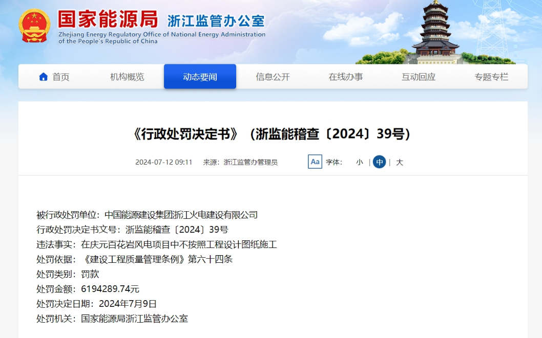 近日,國家能源局浙江監(jiān)管辦公室發(fā)布的《行政處罰決定書》(浙監(jiān)能稽查〔2024〕39號)顯示,中國能源建設集團浙江火電建設有限公司在慶元百花巖風電項目中不按照工程設計圖紙施工,被處以619.428974萬元罰款。