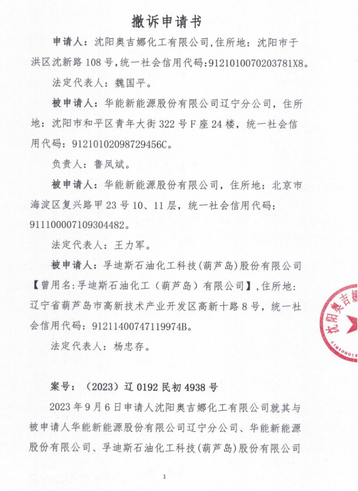 2024年8月13日下午,中國風(fēng)電潤滑油龍頭企業(yè)沈陽奧吉娜化工有限公司(下稱:奧吉娜公司)訴華能新能源股份有限公司遼寧分公司(下稱:華能新能源遼寧分公司或被告一)、華能新能源股份有限公司和孚迪斯石油化工(葫蘆島)有限公司(下稱:被告三)招投標串通案(案號:(2023)遼 0192 民初 4938號),定在沈陽高新技術(shù)產(chǎn)業(yè)開發(fā)區(qū)人民法院自由貿(mào)易試驗區(qū)人民法庭第三次開庭,開庭前奧吉娜公司遞交了撤訴申請書,法院裁定準許撤訴。
