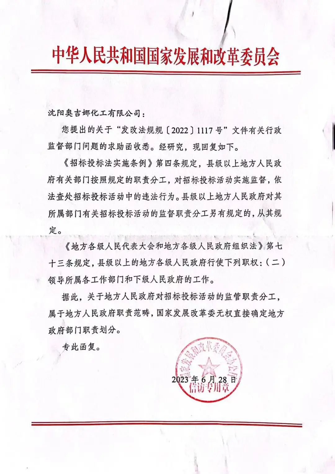 原告曾就被告一和被告三串通投標赤裸裸的違法行為多方尋求監(jiān)督部門監(jiān)管,但一直求告無門,無奈向國家發(fā)展和改革委員會投訴,經(jīng)國家發(fā)展和改革委員會回函“地方人民政府對招標投標活動的監(jiān)管職責分工,屬于地方人民政府職責范疇,國家發(fā)展改革委無權(quán)直接確定地方政府部門職責劃分”(下附國家發(fā)改委回函)。