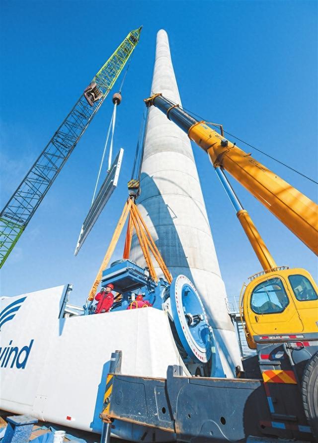 12月18日,在位于新安縣鐵門鎮(zhèn)的雷華風電場項目內,大型機械正在進行風機塔筒吊裝作業(yè)。