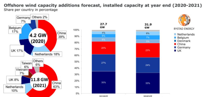 根據(jù)知名能源咨詢公司Rystad Energy數(shù)據(jù)統(tǒng)計,盡管受新冠疫情影響,2020年全球海上風(fēng)電新增裝機4.2GW,同比增長15%,總裝機達到31.9GW。同時,該機構(gòu)預(yù)測今年全球?qū)⑿略鲅b機11.8GW,同比增長37%,最終裝機達到43.7GW。
