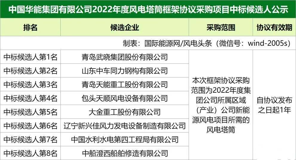 中國華能2022年度風(fēng)電塔筒框架協(xié)議采購項(xiàng)目入圍企業(yè)公示