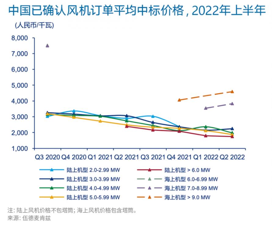 陸上風機平均中標價格在2022年第一季度再創(chuàng)新低。在首個7MW+陸上風電機組的批量訂單中,出現了歷史最低中標價格1408元/千瓦(不含塔筒)。雖然第二季度價格略有回升,但較2021年底水平仍下降了15%。新簽無補貼的海上項目與時間上最鄰近的有補貼的海上項目(2020年)相比,風機平均中標價格(含塔筒)下降了超過40%。大兆瓦機組的廣泛應用,使中國風電整機商能夠以較低的單位千瓦價格進行投標。例如,6MW陸上風機的平均價格比3MW陸上風機平均價格低22%。