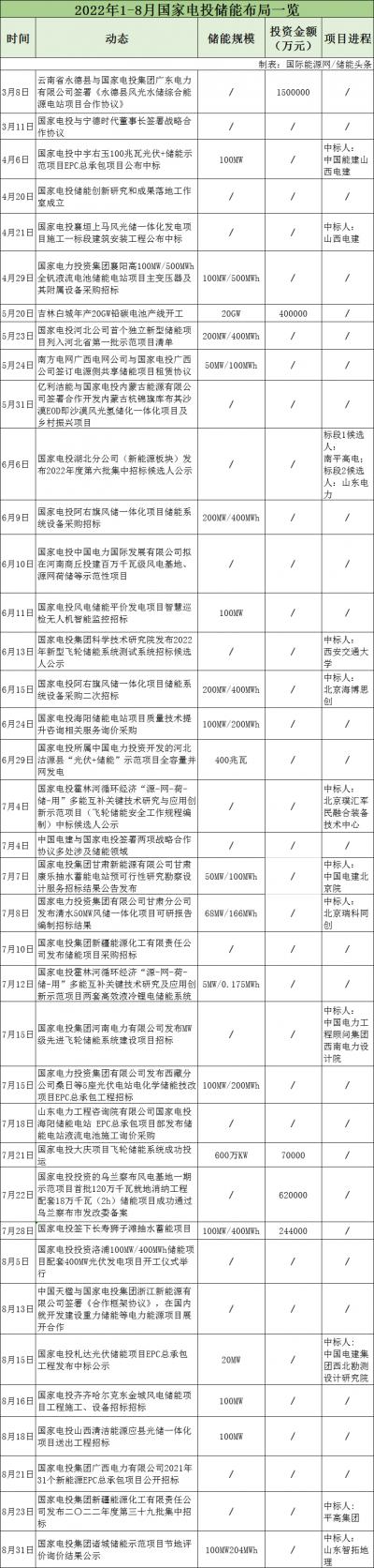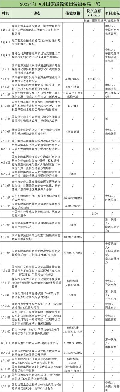 據(jù)不完全統(tǒng)計(jì),2022年1-8月,國家電投與寧德時代、中國電建、中國天楹等簽訂合作協(xié)議,圍繞儲能材料、風(fēng)光氫儲、重力儲能等方面進(jìn)行合作。儲能項(xiàng)目招標(biāo)26個,涉及飛輪儲能、液流電池、鉛炭電池、抽水蓄能及智慧新能源等方面。