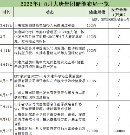 據(jù)不完全統(tǒng)計(jì),2022年1-8月,大唐集團(tuán)儲能項(xiàng)目招標(biāo)3個,與山東、保定、南水北調(diào)集團(tuán)等簽訂合作協(xié)議,涉及抽水蓄能、智慧能源等領(lǐng)域。