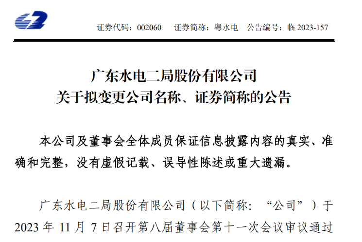 11月8日,廣東水電二局股份有限公司(以下簡稱“粵水電”或“公司”)發(fā)布《關(guān)于擬變更公司名稱、證券簡稱的公告》。