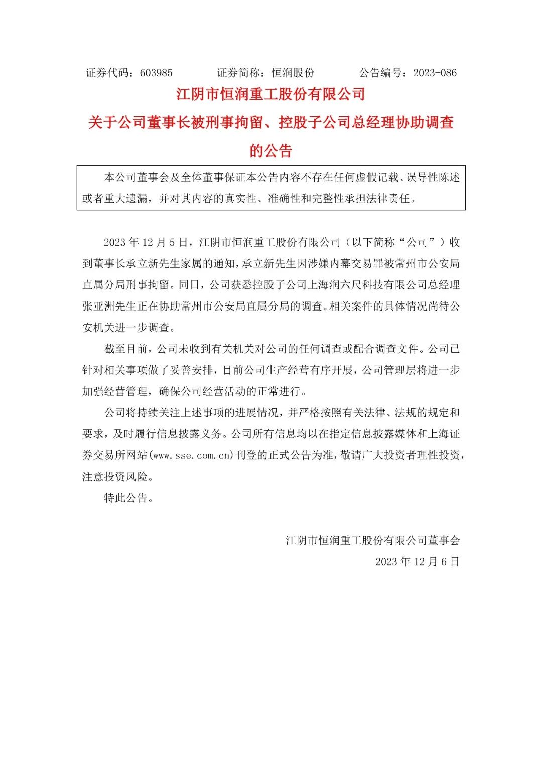 公告顯示, 2023 年 12 月 5 日,江陰市恒潤重工股份有限公司(以下簡稱“公司”)收到董事長承立新先生家屬的通知,承立新先生因涉嫌內(nèi)幕交易罪被常州市公安局直屬分局刑事留。同日,公司獲悉控股子公司上海潤六尺科技有限公司總經(jīng)理張亞洲先生正在協(xié)助常州市公安局直屬分局的調(diào)查。相關(guān)案件的具體情況尚待公安機關(guān)進一步調(diào)查。