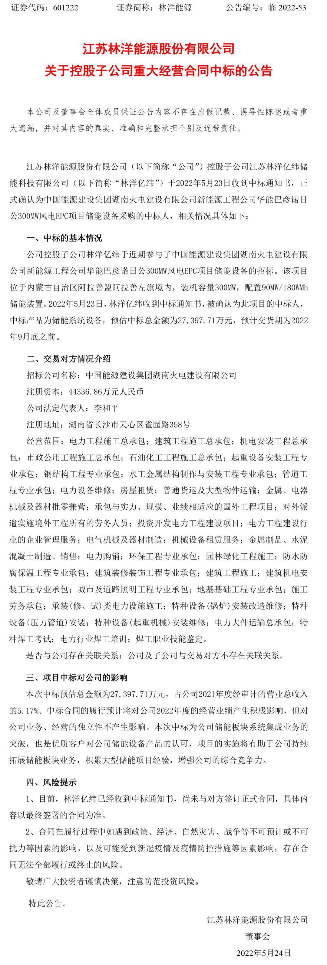 5月23日晚間,林洋能源(601222)(601222.SH)發(fā)布公告,公司控股子公司江蘇林洋億緯儲(chǔ)能科技有限公司正式中標(biāo)中國(guó)能源建設(shè)集團(tuán)湖南火電建設(shè)有限公司新能源工程公司華能巴彥諾日公300MW風(fēng)電EPC項(xiàng)目?jī)?chǔ)能設(shè)備采購(gòu),預(yù)估中標(biāo)總金額為2.74億元。