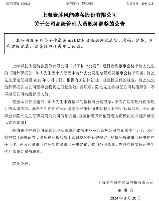 3月20日,上海泰勝風能裝備股份有限公司(簡稱:泰勝風能)發(fā)布關(guān)于公司高級管理人員職務(wù)調(diào)整的公告。