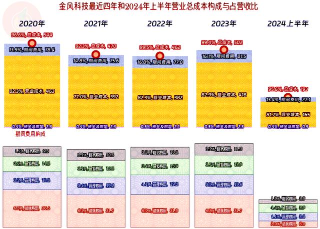 產(chǎn)生這些差異的主要原因是主營業(yè)務(wù)盈利空間變化了,2020年是3.4個百分點(diǎn),2021年接近8個百分點(diǎn),遙遙領(lǐng)先。2022年和2023年就只有可憐的不到一個百分點(diǎn),與2020年毛利率差不多,主要差在期間費(fèi)用占營收比上了,準(zhǔn)確說是差在營收規(guī)模比2020年低了。2024年上半年的期間費(fèi)用控制下來了,再加上營收反彈,主營業(yè)務(wù)盈利空間擴(kuò)大至了4.4個百分點(diǎn),比2020年高,但營收規(guī)模上還有差距,就導(dǎo)致盈利能力還是要差一些。