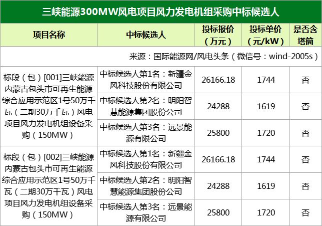 三峽能源內(nèi)蒙古包頭市可再生能源綜合應用示范區(qū)1號50萬千瓦(二期30萬千瓦)風電項目分為兩個標段,標段一和標段二中標候選人分別為金風科技、明陽智能、遠景能源。
