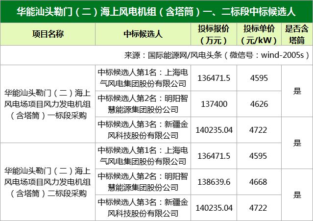 華能汕頭勒門(二)海上風電場項目風力發(fā)電機組(含塔筒)采購一、二標段中標候選人分別為上海電氣、明陽智能、金風科技。