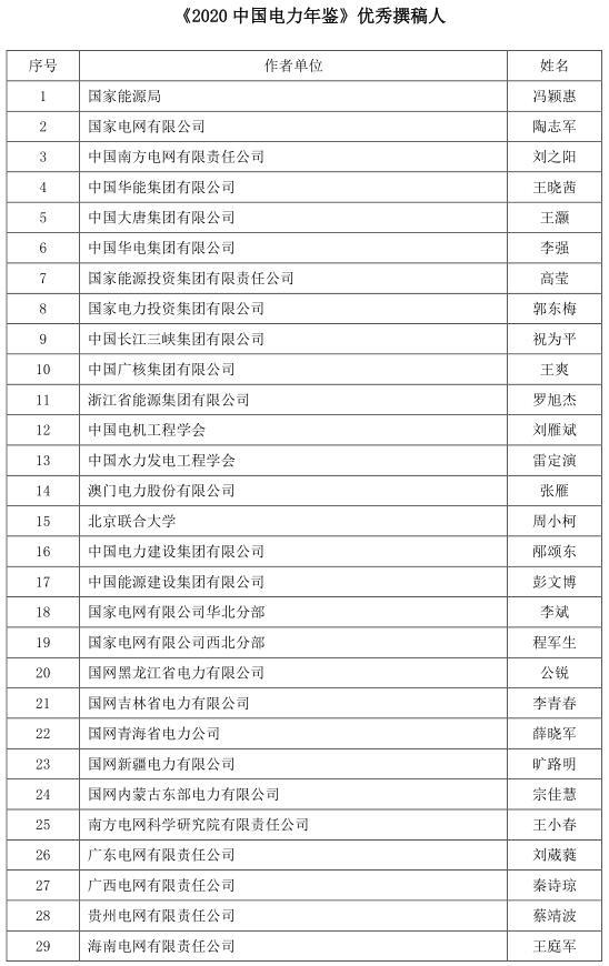 為促進(jìn)《年鑒》編撰質(zhì)量的進(jìn)一步提升,表彰在年鑒編撰工作中表現(xiàn)突出的先進(jìn)個人,根據(jù)《<中國電力年鑒>優(yōu)秀撰稿人評獎辦法(試行)》,經(jīng)年鑒編輯部初評、評選委員會審核,評選出《2020中國電力年鑒》最佳撰稿人和優(yōu)秀撰稿人,現(xiàn)將名單予以公示。