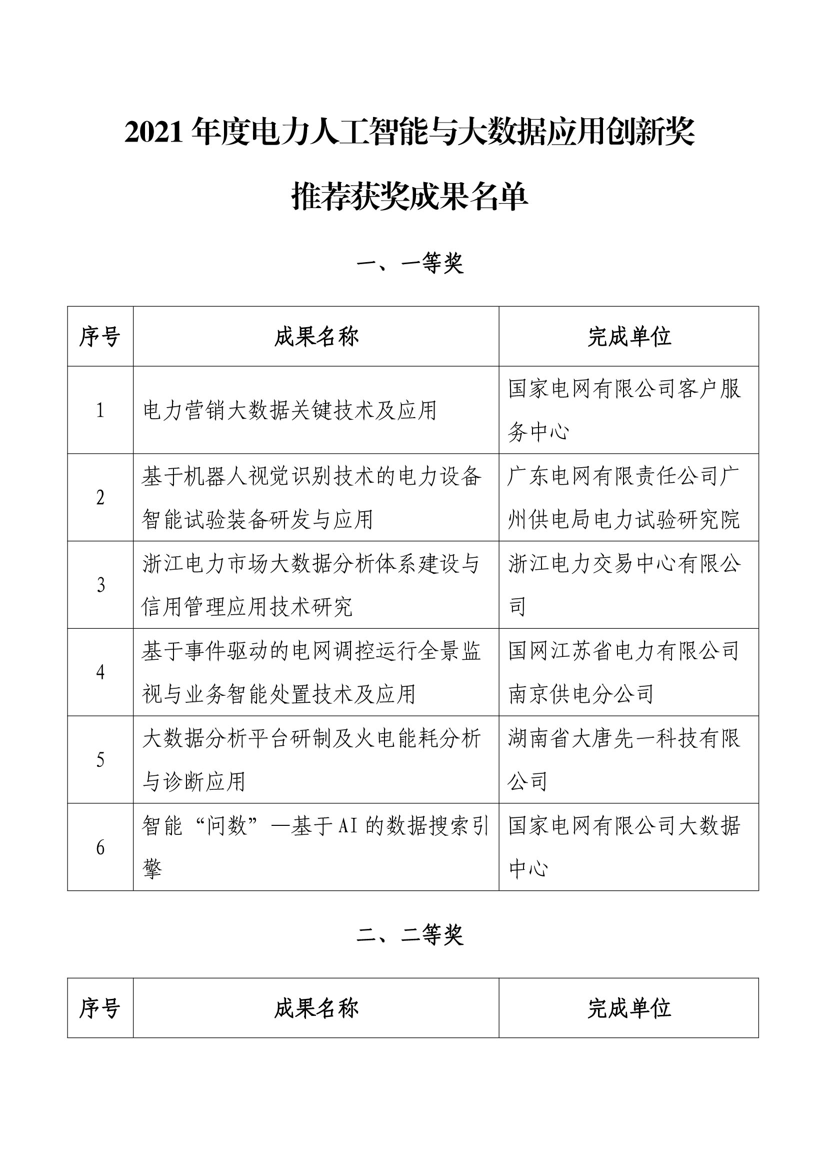 2021年度電力人工智能與大數(shù)據(jù)應(yīng)用創(chuàng)新獎推薦獲獎成果名單