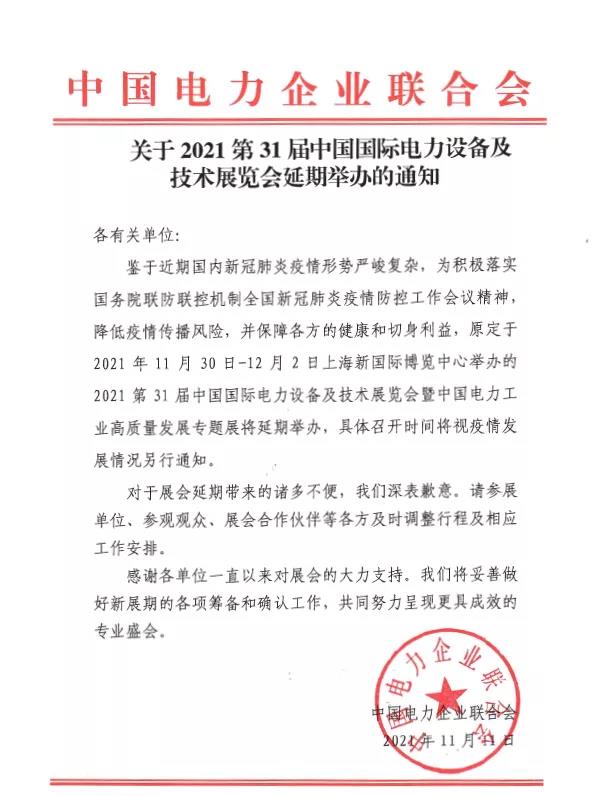 鑒于近期疫情防控形勢趨于嚴峻,為了貫徹落實國務院聯(lián)防聯(lián)控機制防疫要求,以所有參展商與觀眾的健康安全為首要考慮,同時保障展會效果,原定于 2021年11月30日至12月2日在上海新國際博覽中心舉辦的「第三十一屆上海國際電力設(shè)備及技術(shù)展覽會」暨「第二十三屆上海國際電工裝備展覽會」延期舉辦。具體延期方案將根據(jù)政府疫情防控規(guī)定另行通知。
